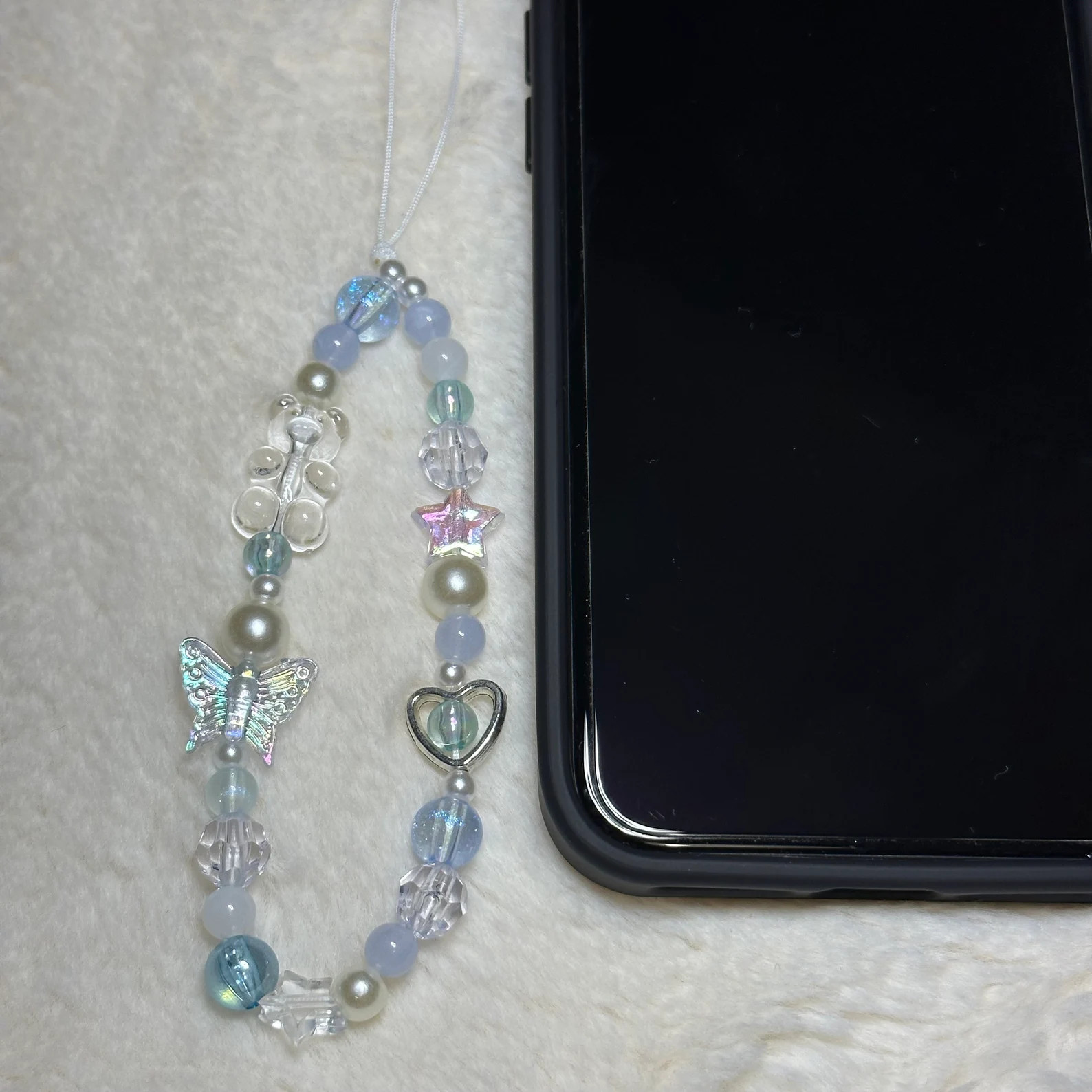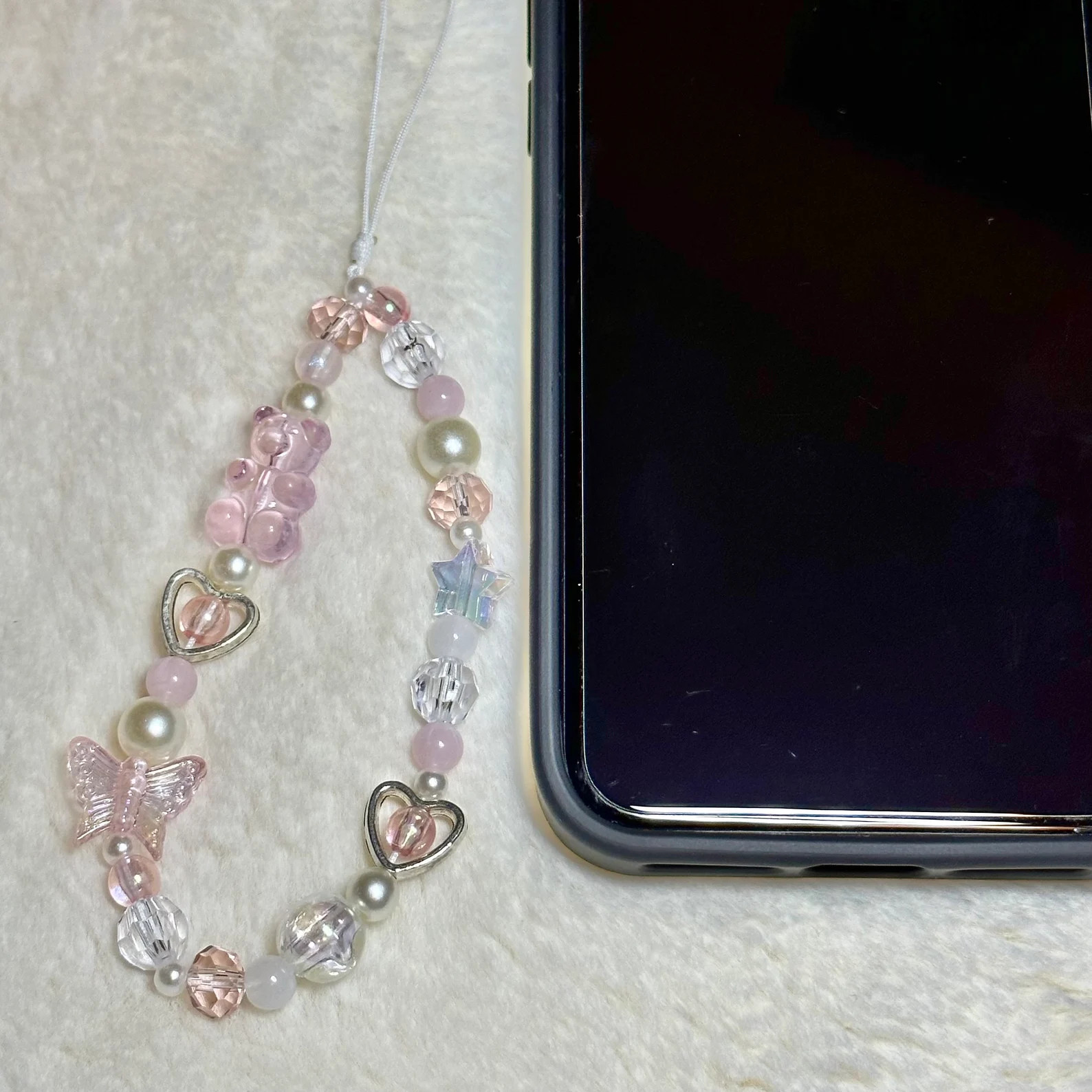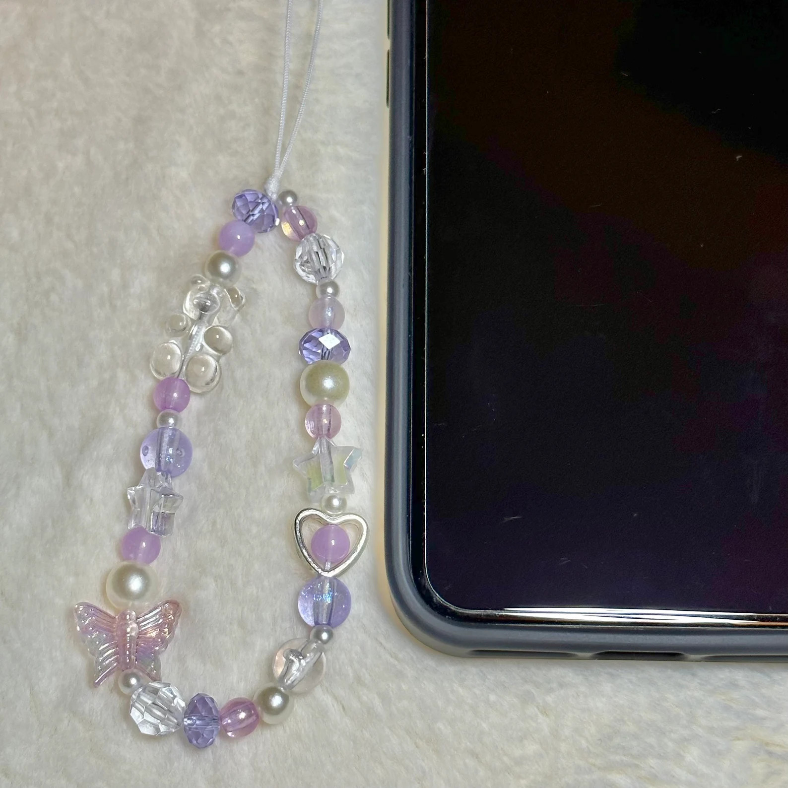 Clear beads, White pearls, Clear Crystal beads, Plastic and Silver Beads, Star, Heart and Butterfly Charms, Pink, Purple and Blue beads